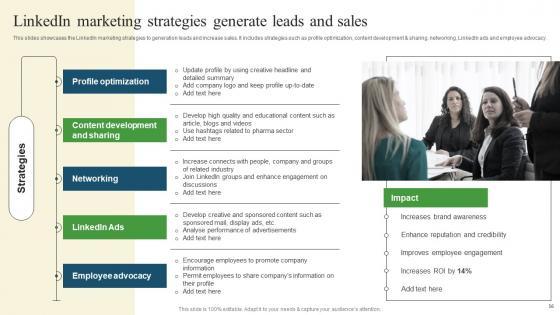 This slides showcases the LinkedIn marketing strategies to generation leads and increase sales. It includes strategies such as profile optimization, content development and sharing, networking, LinkedIn ads and employee advocacy. Slidegeeks has constructed Linkedin Marketing Strategies Pharmaceutical Promotional Strategies To Drive Business Sales Structure Pdf after conducting extensive research and examination. These presentation templates are constantly being generated and modified based on user preferences and critiques from editors. Here, you will find the most attractive templates for a range of purposes while taking into account ratings and remarks from users regarding the content. This is an excellent jumping off point to explore our content and will give new users an insight into our top notch PowerPoint Templates. This slides showcases the LinkedIn marketing strategies to generation leads and increase sales. It includes strategies such as profile optimization, content development and sharing, networking, LinkedIn ads and employee advocacy.