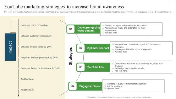 This slides showcases the YouTube marketing strategies to enhance brand awareness. It includes strategies such as develop engaging video content, optimize channel, YouTube ads, engage audience and its impact on business. Slidegeeks is one of the best resources for PowerPoint templates. You can download easily and regulate YouTube Marketing Strategies Pharmaceutical Promotional Strategies To Drive Business Sales Slides Pdf for your personal presentations from our wonderful collection. A few clicks is all it takes to discover and get the most relevant and appropriate templates. Use our Templates to add a unique zing and appeal to your presentation and meetings. All the slides are easy to edit and you can use them even for advertisement purposes. This slides showcases the YouTube marketing strategies to enhance brand awareness. It includes strategies such as develop engaging video content, optimize channel, YouTube ads, engage audience and its impact on business.