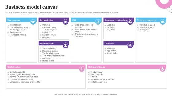 This slide showcases business model canvas of the company including details on partners, activities, resources, channels, revenue streams and cost structure. Find a pre-designed and impeccable Business Model Canvas E Commerce Platform For Furniture PPT Slide BMC SS V. The templates can ace your presentation without additional effort. You can download these easy-to-edit presentation templates to make your presentation stand out from others. So, what are you waiting for Download the template from Slidegeeks today and give a unique touch to your presentation. This slide showcases business model canvas of the company including details on partners, activities, resources, channels, revenue streams and cost structure.