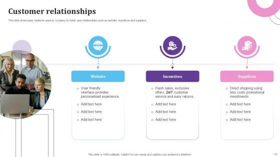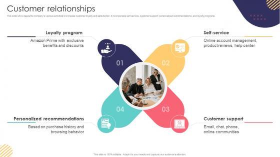 This slide showcases the companys various activities to increase customer loyalty and satisfaction. It incorporates self-service, customer support, personalized recommendations, and loyalty programs. Slidegeeks is one of the best resources for PowerPoint templates. You can download easily and regulate Customer Relationships E Commerce Company Business Model BMC SS V for your personal presentations from our wonderful collection. A few clicks is all it takes to discover and get the most relevant and appropriate templates. Use our Templates to add a unique zing and appeal to your presentation and meetings. All the slides are easy to edit and you can use them even for advertisement purposes. This slide showcases the companys various activities to increase customer loyalty and satisfaction. It incorporates self-service, customer support, personalized recommendations, and loyalty programs.