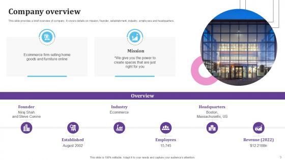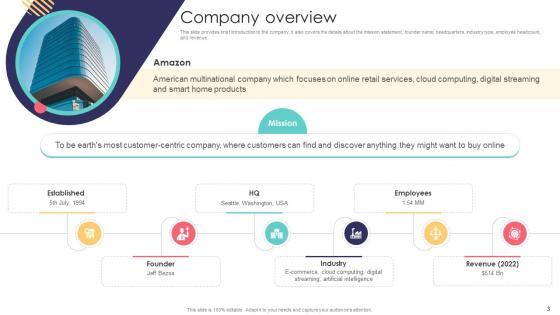 This slide provides brief introduction to the company. It also covers the details about the mission statement, founder name, headquarters, industry type, employee headcount, and revenue. Boost your pitch with our creative Company Overview E Commerce Company Business Model BMC SS V. Deliver an awe-inspiring pitch that will mesmerize everyone. Using these presentation templates you will surely catch everyones attention. You can browse the ppts collection on our website. We have researchers who are experts at creating the right content for the templates. So you do not have to invest time in any additional work. Just grab the template now and use them. This slide provides brief introduction to the company. It also covers the details about the mission statement, founder name, headquarters, industry type, employee headcount, and revenue.
