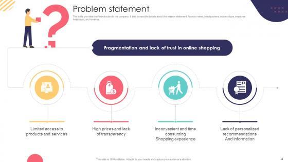 This slide provides brief introduction to the company. It also covers the details about the mission statement, founder name, headquarters, industry type, employee headcount, and revenue. Whether you have daily or monthly meetings, a brilliant presentation is necessary. Problem Statement E Commerce Company Business Model BMC SS V can be your best option for delivering a presentation. Represent everything in detail using Problem Statement E Commerce Company Business Model BMC SS V and make yourself stand out in meetings. The template is versatile and follows a structure that will cater to your requirements. All the templates prepared by Slidegeeks are easy to download and edit. Our research experts have taken care of the corporate themes as well. So, give it a try and see the results. This slide provides brief introduction to the company. It also covers the details about the mission statement, founder name, headquarters, industry type, employee headcount, and revenue.