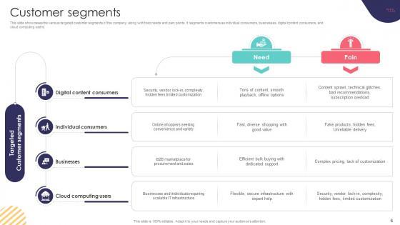 This slide showcases the various targeted customer segments of the company, along with their needs and pain points. It segments customers as individual consumers, businesses, digital content consumers, and cloud computing users. Want to ace your presentation in front of a live audience Our Customer Segments E Commerce Company Business Model BMC SS V can help you do that by engaging all the users towards you. Slidegeeks experts have put their efforts and expertise into creating these impeccable powerpoint presentations so that you can communicate your ideas clearly. Moreover, all the templates are customizable, and easy-to-edit and downloadable. Use these for both personal and commercial use. This slide showcases the various targeted customer segments of the company, along with their needs and pain points. It segments customers as individual consumers, businesses, digital content consumers, and cloud computing users.