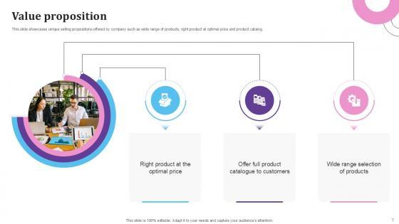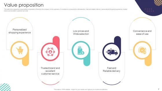 This slide showcases the unique selling proposition offered by the company to its customers. It includes low prices and a wide selection, fast and reliable delivery, personalized shopping experience, trusted brand, and excellent customer services. Are you in need of a template that can accommodate all of your creative concepts This one is crafted professionally and can be altered to fit any style. Use it with Google Slides or PowerPoint. Include striking photographs, symbols, depictions, and other visuals. Fill, move around, or remove text boxes as desired. Test out color palettes and font mixtures. Edit and save your work, or work with colleagues. Download Value Proposition E Commerce Company Business Model BMC SS V and observe how to make your presentation outstanding. Give an impeccable presentation to your group and make your presentation unforgettable. This slide showcases the unique selling proposition offered by the company to its customers. It includes low prices and a wide selection, fast and reliable delivery, personalized shopping experience, trusted brand, and excellent customer services.