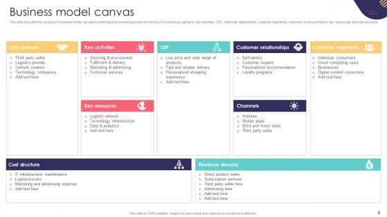 This E Commerce Company Business Model Ppt Powerpoint Presentation Complete Deck BMC V is designed to help you retain your audiences attention. This content-ready PowerPoint Template enables you to take your audience on a journey and share information in a way that is easier to recall. It helps you highlight the crucial parts of your work so that the audience does not get saddled with information download. This twenty four slide PPT Deck comes prepared with the graphs and charts you could need to showcase your information through visuals. You only need to enter your own data in them. Download this editable PowerPoint Theme and walk into that meeting with confidence. Our E Commerce Company Business Model Ppt Powerpoint Presentation Complete Deck BMC V are topically designed to provide an attractive backdrop to any subject. Use them to look like a presentation pro.