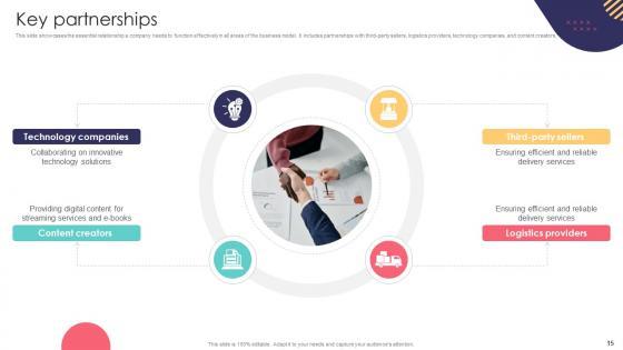 This slide showcases the essential relationship a company needs to function effectively in all areas of the business model. It includes partnerships with third-party sellers, logistics providers, technology companies, and content creators. Present like a pro with Key Partnerships E Commerce Company Business Model BMC SS V. Create beautiful presentations together with your team, using our easy-to-use presentation slides. Share your ideas in real-time and make changes on the fly by downloading our templates. So whether you are in the office, on the go, or in a remote location, you can stay in sync with your team and present your ideas with confidence. With Slidegeeks presentation got a whole lot easier. Grab these presentations today. This slide showcases the essential relationship a company needs to function effectively in all areas of the business model. It includes partnerships with third-party sellers, logistics providers, technology companies, and content creators.