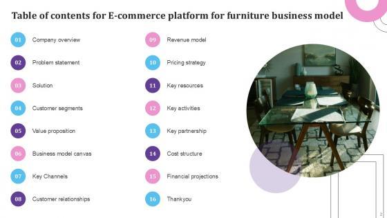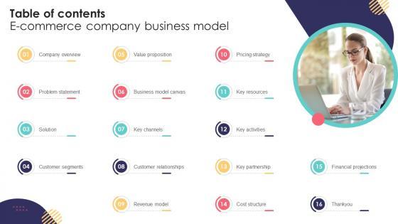 If you are looking for a format to display your unique thoughts, then the professionally designed Table Of Contents E Commerce Company Business Model BMC SS V is the one for you. You can use it as a Google Slides template or a PowerPoint template. Incorporate impressive visuals, symbols, images, and other charts. Modify or reorganize the text boxes as you desire. Experiment with shade schemes and font pairings. Alter, share or cooperate with other people on your work. Download Table Of Contents E Commerce Company Business Model BMC SS V and find out how to give a successful presentation. Present a perfect display to your team and make your presentation unforgettable. Our Table Of Contents E Commerce Company Business Model BMC SS V are topically designed to provide an attractive backdrop to any subject. Use them to look like a presentation pro.