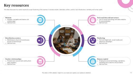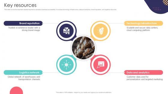 This slide covers the important assets required to operate a business successfully. It includes technology infrastructure, data and analytics, brand reputation, and logistics networks. Slidegeeks is here to make your presentations a breeze with Key Resources E Commerce Company Business Model BMC SS V With our easy-to-use and customizable templates, you can focus on delivering your ideas rather than worrying about formatting. With a variety of designs to choose from, you are sure to find one that suits your needs. And with animations and unique photos, illustrations, and fonts, you can make your presentation pop. So whether you are giving a sales pitch or presenting to the board, make sure to check out Slidegeeks first This slide covers the important assets required to operate a business successfully. It includes technology infrastructure, data and analytics, brand reputation, and logistics networks.