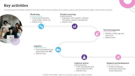 This slide covers the most curtailed activity the company performs to operate a business successfully. It includes product sourcing and procurement, marketing and advertising, customer services, fulfillment and delivery, and technology development. Get a simple yet stunning designed Key Activities E Commerce Company Business Model BMC SS V. It is the best one to establish the tone in your meetings. It is an excellent way to make your presentations highly effective. So, download this PPT today from Slidegeeks and see the positive impacts. Our easy-to-edit Key Activities E Commerce Company Business Model BMC SS V can be your go-to option for all upcoming conferences and meetings. So, what are you waiting for Grab this template today. This slide covers the most curtailed activity the company performs to operate a business successfully. It includes product sourcing and procurement, marketing and advertising, customer services, fulfillment and delivery, and technology development.
