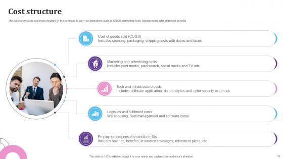 This slide showcases all the expenses and costs a company incurs to operate its business successfully. It includes costs such as IT infrastructure maintenance, logistics costs, and marketing and advertising expenses. Create an editable Cost Structure E Commerce Company Business Model BMC SS V that communicates your idea and engages your audience. Whether you are presenting a business or an educational presentation, pre-designed presentation templates help save time. Cost Structure E Commerce Company Business Model BMC SS V is highly customizable and very easy to edit, covering many different styles from creative to business presentations. Slidegeeks has creative team members who have crafted amazing templates. So, go and get them without any delay. This slide showcases all the expenses and costs a company incurs to operate its business successfully. It includes costs such as IT infrastructure maintenance, logistics costs, and marketing and advertising expenses.
