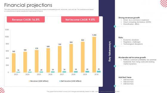 This slide presents the financial projections showcasing the companys anticipated growth, net income, cost, and risk. The predictions are based on comprehensive market analysis and historical performance. There are so many reasons you need a Financial Projections E Commerce Company Business Model BMC SS V. The first reason is you can not spend time making everything from scratch, Thus, Slidegeeks has made presentation templates for you too. You can easily download these templates from our website easily. This slide presents the financial projections showcasing the companys anticipated growth, net income, cost, and risk. The predictions are based on comprehensive market analysis and historical performance.
