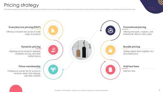 This slide showcases how the company will determine product and service prices. It includes pricing strategies such as everyday low pricing, dynamic pricing, prime membership, promotional pricing, and bundle pricing. Do you have an important presentation coming up Are you looking for something that will make your presentation stand out from the rest Look no further than Pricing Strategy E Commerce Company Business Model BMC SS V. With our professional designs, you can trust that your presentation will pop and make delivering it a smooth process. And with Slidegeeks, you can trust that your presentation will be unique and memorable. So why wait Grab Pricing Strategy E Commerce Company Business Model BMC SS V today and make your presentation stand out from the rest This slide showcases how the company will determine product and service prices. It includes pricing strategies such as everyday low pricing, dynamic pricing, prime membership, promotional pricing, and bundle pricing.