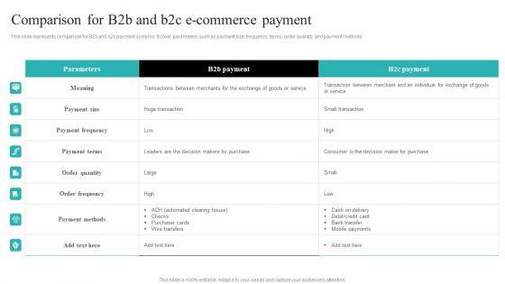 This slide represents comparison for b2b and b2c payment systems. It cover parameters such as payment size, frequency, terms, order quantity and payment methods.Whether you have daily or monthly meetings, a brilliant presentation is necessary. Comparison For B2b And B2c E Commerce Payment Comprehensive Guide For Developing Graphics PDF can be your best option for delivering a presentation. Represent everything in detail using Comparison For B2b And B2c E Commerce Payment Comprehensive Guide For Developing Graphics PDF and make yourself stand out in meetings. The template is versatile and follows a structure that will cater to your requirements. All the templates prepared by Slidegeeks are easy to download and edit. Our research experts have taken care of the corporate themes as well. So, give it a try and see the results.