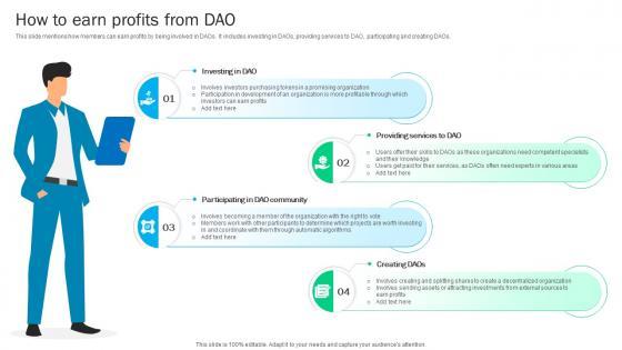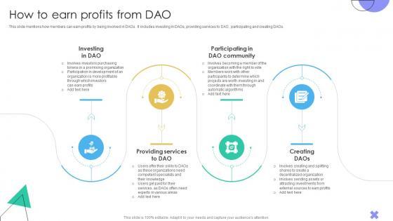 This slide mentions how members can earn profits by being involved in DAOs. It includes investing in DAOs, providing services to DAO, participating and creating DAOs. Coming up with a presentation necessitates that the majority of the effort goes into the content and the message you intend to convey. The visuals of a PowerPoint presentation can only be effective if it supplements and supports the story that is being told. Keeping this in mind our experts created Guide To Understanding Decentralized How To Earn Profits From DAO BCT SS V to reduce the time that goes into designing the presentation. This way, you can concentrate on the message while our designers take care of providing you with the right template for the situation. This slide mentions how members can earn profits by being involved in DAOs. It includes investing in DAOs, providing services to DAO, participating and creating DAOs.