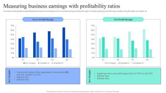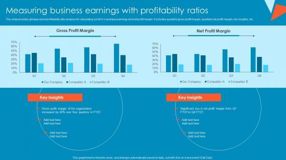 This slide provides glimpse about profitability ratio analysis for calculating our firms business earnings and net profit margin. It includes quarterly gross profit margin, quarterly net profit margin, key insights, etc. The Adjusting Financial Strategies And Planning Measuring Business Earnings With Profitability Ratios Download PDF is a compilation of the most recent design trends as a series of slides. It is suitable for any subject or industry presentation, containing attractive visuals and photo spots for businesses to clearly express their messages. This template contains a variety of slides for the user to input data, such as structures to contrast two elements, bullet points, and slides for written information. Slidegeeks is prepared to create an impression.