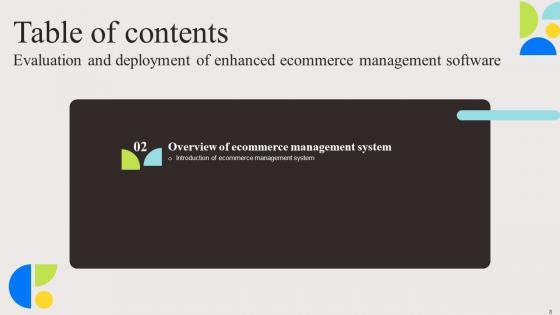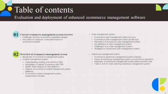 This Table Of Contents For Deploying Ecommerce Order Management Software Themes PDF from Slidegeeks makes it easy to present information on your topic with precision. It provides customization options, so you can make changes to the colors, design, graphics, or any other component to create a unique layout. It is also available for immediate download, so you can begin using it right away. Slidegeeks has done good research to ensure that you have everything you need to make your presentation stand out. Make a name out there for a brilliant performance.