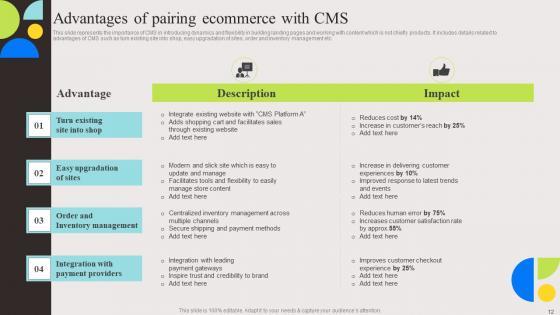 This slide represents the importance of CMS in introducing dynamics and flexibility in building landing pages and working with content which is not chiefly products. It includes details related to advantages of CMS such as turn existing site into shop, easy upgradation of sites, order and inventory management etc.Find a pre-designed and impeccable Advantages Of Pairing Ecommerce With Cms Deploying Ecommerce Order Management Software Download PDF. The templates can ace your presentation without additional effort. You can download these easy-to-edit presentation templates to make your presentation stand out from others. So, what are you waiting for Download the template from Slidegeeks today and give a unique touch to your presentation.