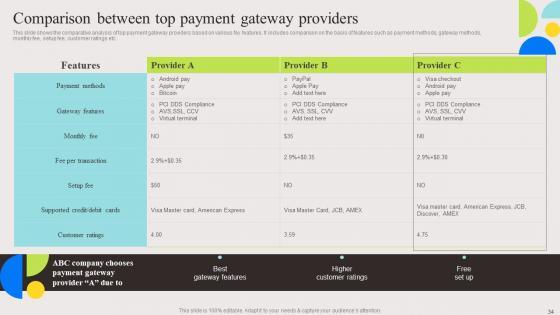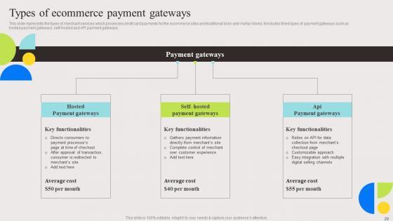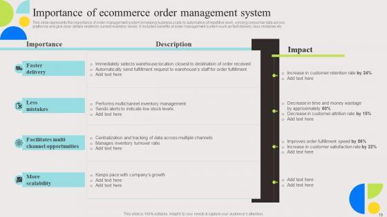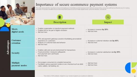 This slide represents the importance of payment gateways in facilitating systemized payment methods and providing consumers with fast and flexible way for making payments. It includes benefits of ecommerce payment systems such as meets digital needs, customer retention, security etc.This modern and well-arranged Importance Of Secure Ecommerce Payment Systems Deploying Ecommerce Order Management Software Rules PDF provides lots of creative possibilities. It is very simple to customize and edit with the Powerpoint Software. Just drag and drop your pictures into the shapes. All facets of this template can be edited with Powerpoint no extra software is necessary. Add your own material, put your images in the places assigned for them, adjust the colors, and then you can show your slides to the world, with an animated slide included.