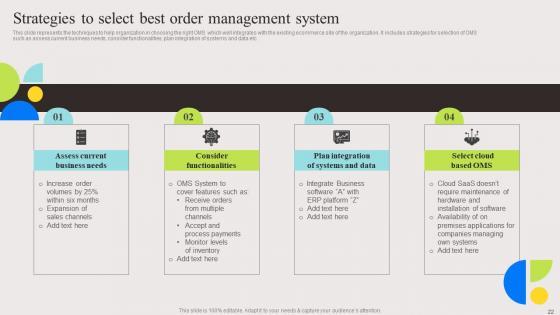 This slide represents the techniques to help organization in choosing the right OMS which well integrates with the existing ecommerce site of the organization. It includes strategies for selection of OMS such as assess current business needs, consider functionalities, plan integration of systems and data etc.Retrieve professionally designed Strategies To Select Best Order Management System Deploying Ecommerce Order Management Software Download PDF to effectively convey your message and captivate your listeners. Save time by selecting pre-made slideshows that are appropriate for various topics, from business to educational purposes. These themes come in many different styles, from creative to corporate, and all of them are easily adjustable and can be edited quickly. Access them as PowerPoint templates or as Google Slides themes. You Do not have to go on a hunt for the perfect presentation because Slidegeeks got you covered from everywhere.