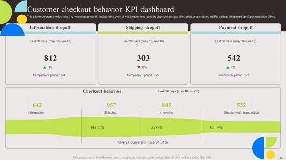 This slide represents the dashboard to help management in analyzing the point at which customers leave the checkout process. It includes details related to KPIs such as shipping drop-off, payment drop-off etc.Present like a pro with Customer Checkout Behavior Kpi Dashboard Deploying Ecommerce Order Management Software Demonstration PDF Create beautiful presentations together with your team, using our easy-to-use presentation slides. Share your ideas in real-time and make changes on the fly by downloading our templates. So whether you are in the office, on the go, or in a remote location, you can stay in sync with your team and present your ideas with confidence. With Slidegeeks presentation got a whole lot easier. Grab these presentations today.