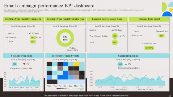 This slide covers dashboard providing an insight related to how subscribers and resonating with email marketing campaign. It key performance metrics such as sessions from email, sessions from email by campaign, sessions by email by date etc.Are you in need of a template that can accommodate all of your creative concepts This one is crafted professionally and can be altered to fit any style. Use it with Google Slides or PowerPoint. Include striking photographs, symbols, depictions, and other visuals. Fill, move around, or remove text boxes as desired. Test out color palettes and font mixtures. Edit and save your work, or work with colleagues. Download Email Campaign Performance Kpi Dashboard Deploying Ecommerce Order Management Software Professional PDF and observe how to make your presentation outstanding. Give an impeccable presentation to your group and make your presentation unforgettable.