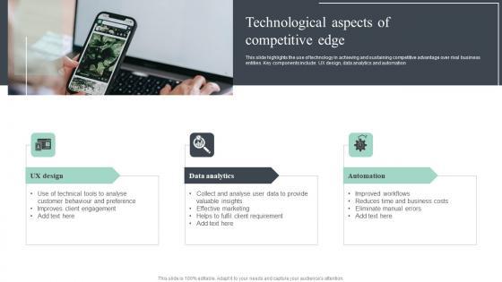 This slide highlights the use of technology in achieving and sustaining competitive advantage over rival business entities. Key components include UX design, data analytics and automation Showcasing this set of slides titled Technological Aspects Of Competitive Edge Guidelines Pdf. The topics addressed in these templates are UX Design, Data Analytics, Automation. All the content presented in this PPT design is completely editable. Download it and make adjustments in color, background, font etc. as per your unique business setting. This slide highlights the use of technology in achieving and sustaining competitive advantage over rival business entities. Key components include UX design, data analytics and automation