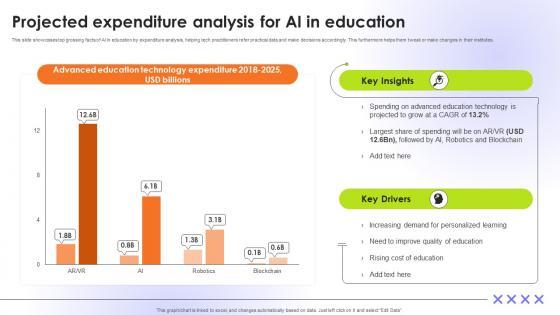 This slide showcases top grossing facts of AI in education by expenditure analysis, helping tech practitioners refer practical data and make decisions accordingly. This furthermore helps them tweak or make changes in their institutes. Slidegeeks is here to make your presentations a breeze with Projected Expenditure Analysis For AI In Education Educational Transformation Through AI SS V With our easy-to-use and customizable templates, you can focus on delivering your ideas rather than worrying about formatting. With a variety of designs to choose from, you are sure to find one that suits your needs. And with animations and unique photos, illustrations, and fonts, you can make your presentation pop. So whether you are giving a sales pitch or presenting to the board, make sure to check out Slidegeeks first This slide showcases top grossing facts of AI in education by expenditure analysis, helping tech practitioners refer practical data and make decisions accordingly. This furthermore helps them tweak or make changes in their institutes.