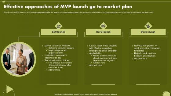This slide shows MVP launchs go to market strategy with its effective approaches to test business ideas in the real world market. It further includes approaches such as soft launch, hard launch, and dark launch Pitch your topic with ease and precision using this Effective Approaches Of MVP Launch Go To Market Plan Microsoft Pdf. This layout presents information on Gather Consumer Feedback, Collecting Consumer Opinions, Mature Products. It is also available for immediate download and adjustment. So, changes can be made in the color, design, graphics or any other component to create a unique layout. This slide shows MVP launchs go to market strategy with its effective approaches to test business ideas in the real world market. It further includes approaches such as soft launch, hard launch, and dark launch