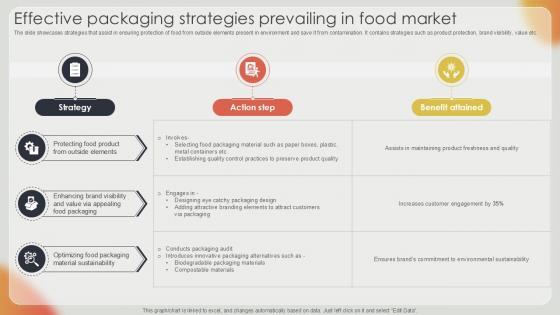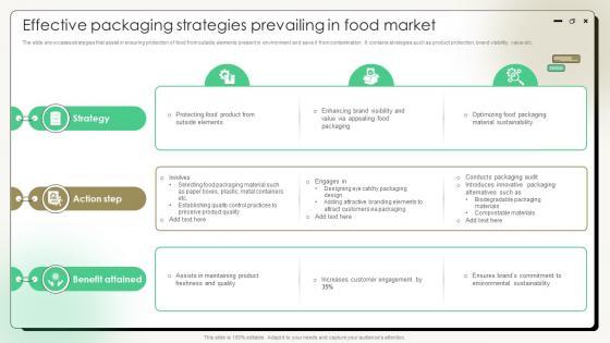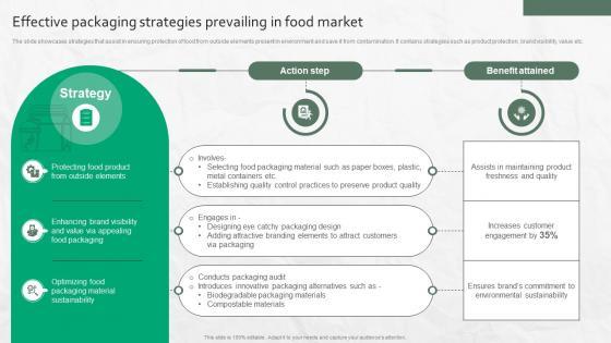 The slide showcases strategies that assist in ensuring protection of food from outside elements present in environment and save it from contamination. It contains strategies such as product protection, brand visibility, value etc. Get a simple yet stunning designed Effective Packaging Strategies Prevailing In Food Market. It is the best one to establish the tone in your meetings. It is an excellent way to make your presentations highly effective. So, download this PPT today from Slidegeeks and see the positive impacts. Our easy-to-edit Effective Packaging Strategies Prevailing In Food Market can be your go-to option for all upcoming conferences and meetings. So, what are you waiting for Grab this template today. The slide showcases strategies that assist in ensuring protection of food from outside elements present in environment and save it from contamination. It contains strategies such as product protection, brand visibility, value etc.