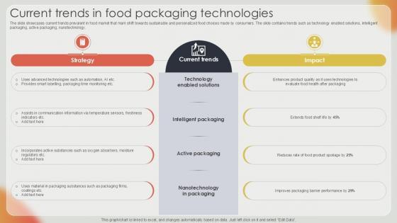 The slide showcases current trends prevalent in food market that mark shift towards sustainable and personalized food choices made by consumers. The slide contains trends such as technology enabled solutions, intelligent packaging, active packaging, nanotechnology. Do you have to make sure that everyone on your team knows about any specific topic I yes, then you should give Current Trends In Food Packaging Effective Strategies For Strengthening Food Ppt Presentation a try. Our experts have put a lot of knowledge and effort into creating this impeccable Current Trends In Food Packaging Effective Strategies For Strengthening Food Ppt Presentation. You can use this template for your upcoming presentations, as the slides are perfect to represent even the tiniest detail. You can download these templates from the Slidegeeks website and these are easy to edit. So grab these today The slide showcases current trends prevalent in food market that mark shift towards sustainable and personalized food choices made by consumers. The slide contains trends such as technology enabled solutions, intelligent packaging, active packaging, nanotechnology.