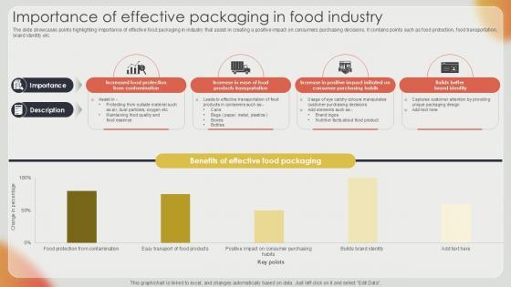 The slide showcases points highlighting importance of effective food packaging in industry that assist in creating a positive impact on consumers purchasing decisions. It contains points such as food protection, food transportation, brand identity etc. Are you in need of a template that can accommodate all of your creative concepts This one is crafted professionally and can be altered to fit any style. Use it with Google Slides or PowerPoint. Include striking photographs, symbols, depictions, and other visuals. Fill, move around, or remove text boxes as desired. Test out color palettes and font mixtures. Edit and save your work, or work with colleagues. Download Importance Of Effective Packaging Effective Strategies For Strengthening Food Ppt Sample and observe how to make your presentation outstanding. Give an impeccable presentation to your group and make your presentation unforgettable. The slide showcases points highlighting importance of effective food packaging in industry that assist in creating a positive impact on consumers purchasing decisions. It contains points such as food protection, food transportation, brand identity etc.