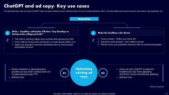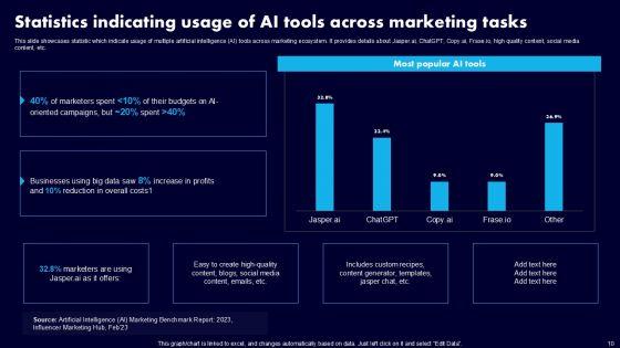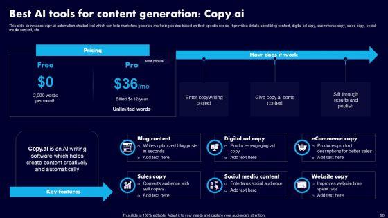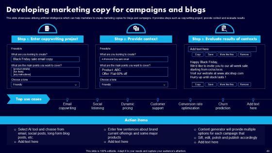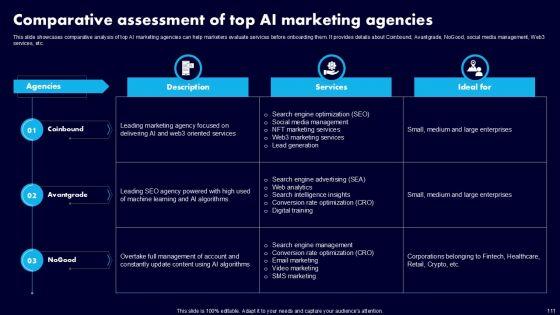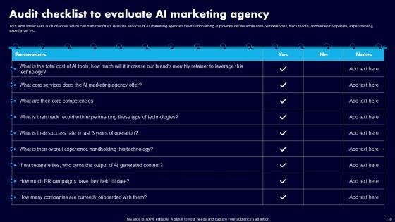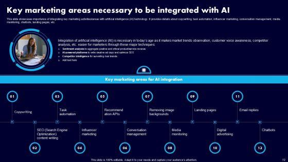 This AI Powered Advertising How To Get More Effective Results From Automation Ppt PowerPoint Presentation Complete Deck With Slides is a primer on how to capitalize on business opportunities through planning, innovation, and market intelligence. The content-ready format of the complete deck will make your job as a decision-maker a lot easier. Use this ready-made PowerPoint Template to help you outline an extensive and legible plan to capture markets and grow your company on the right path, at an exponential pace. What is even more amazing is that this presentation is completely editable and 100 percent customizable. This one hundred ninteen slide complete deck helps you impress a roomful of people with your expertise in business and even presentation. Craft such a professional and appealing presentation for that amazing recall value. Download now.