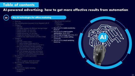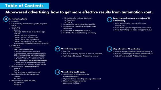 Here you can discover an assortment of the finest PowerPoint and Google Slides templates. With these templates, you can create presentations for a variety of purposes while simultaneously providing your audience with an eye-catching visual experience. Download AI Powered Advertising How To Get More Effective Results From Automation Table Of Contents Download PDF to deliver an impeccable presentation. These templates will make your job of preparing presentations much quicker, yet still, maintain a high level of quality. Slidegeeks has experienced researchers who prepare these templates and write high-quality content for you. Later on, you can personalize the content by editing the AI Powered Advertising How To Get More Effective Results From Automation Table Of Contents Download PDF.