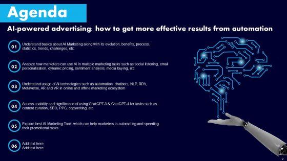 Presenting this PowerPoint presentation, titled Agenda AI Powered Advertising How To Get More Effective Results From Automation Slides PDF, with topics curated by our researchers after extensive research. This editable presentation is available for immediate download and provides attractive features when used. Download now and captivate your audience. Presenting this Agenda AI Powered Advertising How To Get More Effective Results From Automation Slides PDF. Our researchers have carefully researched and created these slides with all aspects taken into consideration. This is a completely customizable Agenda AI Powered Advertising How To Get More Effective Results From Automation Slides PDF that is available for immediate downloading. Download now and make an impact on your audience. Highlight the attractive features available with our PPTs.