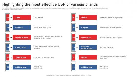 The following slide exhibits the unique selling point of top brands such as Apple, Five Guys, Dominos pizza, Pureformulas, TOMS shoes, M and Ms. Colgate etc. Examining these USPs will assist the businesses to create their own and distinctive USP. The Highlighting The Most Effective Usp Of Various Brands Ppt File Outline PDF is a compilation of the most recent design trends as a series of slides. It is suitable for any subject or industry presentation, containing attractive visuals and photo spots for businesses to clearly express their messages. This template contains a variety of slides for the user to input data, such as structures to contrast two elements, bullet points, and slides for written information. Slidegeeks is prepared to create an impression.