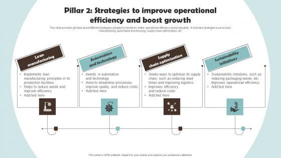 This slide provides glimpse about different strategies adopted by Nestle for better operational efficiency and productivity. It includes strategies such as lean manufacturing, automation and technology, supply chain optimization, etc.Presenting this PowerPoint presentation, titled Pillar 2 Strategies To Improve Operational Efficiency Outline Of Nestle Management Microsoft Pdf, with topics curated by our researchers after extensive research. This editable presentation is available for immediate download and provides attractive features when used. Download now and captivate your audience. Presenting this Pillar 2 Strategies To Improve Operational Efficiency Outline Of Nestle Management Microsoft Pdf. Our researchers have carefully researched and created these slides with all aspects taken into consideration. This is a completely customizable Pillar 2 Strategies To Improve Operational Efficiency Outline Of Nestle Management Microsoft Pdf that is available for immediate downloading. Download now and make an impact on your audience. Highlight the attractive features available with our PPTs. This slide provides glimpse about different strategies adopted by Nestle for better operational efficiency and productivity. It includes strategies such as lean manufacturing, automation And technology, supply chain optimization, etc.
