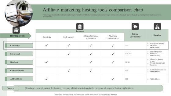 Following slide exhibits hosting tools for implementation of affiliate marketing to boost company online sales. It include elements such as hosting tools, features, pricing and benefits. Boost your pitch with our creative Affiliate Marketing Hosting Tools Comparison Chart Efficient Marketing Tactics Sample Pdf. Deliver an awe-inspiring pitch that will mesmerize everyone. Using these presentation templates you will surely catch everyones attention. You can browse the ppts collection on our website. We have researchers who are experts at creating the right content for the templates. So you do not have to invest time in any additional work. Just grab the template now and use them. Following slide exhibits hosting tools for implementation of affiliate marketing to boost company online sales. It include elements such as hosting tools, features, pricing and benefits.