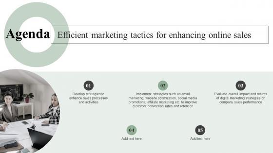 Create an editable Agenda Efficient Marketing Tactics For Enhancing Online Sales Summary Pdf that communicates your idea and engages your audience. Whether you are presenting a business or an educational presentation, pre-designed presentation templates help save time. Agenda Efficient Marketing Tactics For Enhancing Online Sales Summary Pdf is highly customizable and very easy to edit, covering many different styles from creative to business presentations. Slidegeeks has creative team members who have crafted amazing templates. So, go and get them without any delay. Our Agenda Efficient Marketing Tactics For Enhancing Online Sales Summary Pdf are topically designed to provide an attractive backdrop to any subject. Use them to look like a presentation pro.