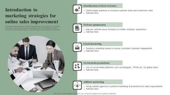 Following slide showcases various strategies that can be used by companies to increase online sales. It include strategies such as identification of ideal customer, website optimization, email marketing, social media promotions etc. Explore a selection of the finest Introduction To Marketing Strategies For Online Efficient Marketing Tactics Mockup Pdf here. With a plethora of professionally designed and pre-made slide templates, you can quickly and easily find the right one for your upcoming presentation. You can use our Introduction To Marketing Strategies For Online Efficient Marketing Tactics Mockup Pdf to effectively convey your message to a wider audience. Slidegeeks has done a lot of research before preparing these presentation templates. The content can be personalized and the slides are highly editable. Grab templates today from Slidegeeks. Following slide showcases various strategies that can be used by companies to increase online sales. It include strategies such as identification of ideal customer, website optimization, email marketing, social media promotions etc.