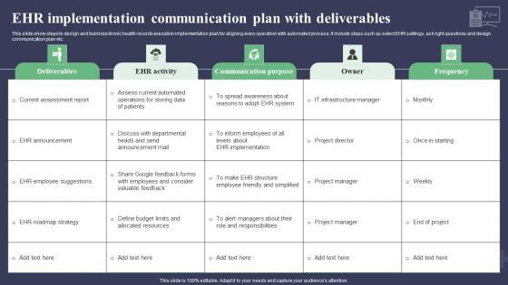 This slide show steps to design and build electronic health records execution implementation plan for aligning every operation with automated process. It include steps such as select EHR settings, ask right questions and design communication plan etc.Pitch your topic with ease and precision using this EHR Implementation Communication Plan With Deliverables Pictures Pdf This layout presents information on Current Assessment Report, Employee Suggestions, Roadmap Strategy It is also available for immediate download and adjustment. So, changes can be made in the color, design, graphics or any other component to create a unique layout. This slide show steps to design and build electronic health records execution implementation plan for aligning every operation with automated process. It include steps such as select EHR settings, ask right questions and design communication plan etc.