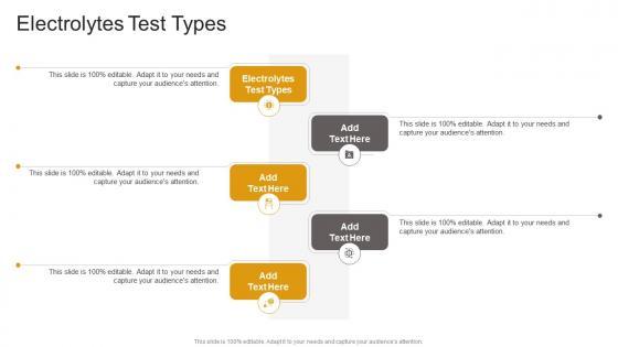 Presenting our innovatively-designed set of slides titled Electrolytes Test Types In Powerpoint And Google Slides Cpb. This completely editable PowerPoint graphic exhibits Electrolytes Test Types that will help you convey the message impactfully. It can be accessed with Google Slides and is available in both standard screen and widescreen aspect ratios. Apart from this, you can download this well-structured PowerPoint template design in different formats like PDF, JPG, and PNG. So, click the download button now to gain full access to this PPT design. Our Electrolytes Test Types In Powerpoint And Google Slides Cpb are topically designed to provide an attractive backdrop to any subject. Use them to look like a presentation pro.