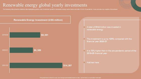 The following slide presents statistical data highlighting global yearly investment growth in renewable energy sector before and after COVID-19 pandemic. It also provides key insights of investment. There are so many reasons you need a Renewable Energy Global Yearly Investments Demonstration PDF. The first reason is you can not spend time making everything from scratch, Thus, Slidegeeks has made presentation templates for you too. You can easily download these templates from our website easily.