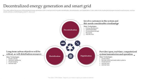 This slide outlines the process of decentralized energy generation in the smart grid and it includes electrification, decentralization, and digitalization. It also caters to the leading technologies involved in each process, such as electric vehicles, smart charging, solar PV, and so on. Slidegeeks is one of the best resources for PowerPoint templates. You can download easily and regulate Smart Grid Technology Decentralized Energy Generation And Smart Grid Sample PDF for your personal presentations from our wonderful collection. A few clicks is all it takes to discover and get the most relevant and appropriate templates. Use our Templates to add a unique zing and appeal to your presentation and meetings. All the slides are easy to edit and you can use them even for advertisement purposes.