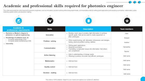 This slide represents the skills required for photonic engineers, such as innovation, problem-solving while doing experiments, communication skills for writing grant applications and studying summaries, mathematics, active listening, quality control, and decision-making. Get a simple yet stunning designed Fibers IT Academic And Professional Skills Required For Photonics Engineer. It is the best one to establish the tone in your meetings. It is an excellent way to make your presentations highly effective. So, download this PPT today from Slidegeeks and see the positive impacts. Our easy-to-edit Fibers IT Academic And Professional Skills Required For Photonics Engineer can be your go-to option for all upcoming conferences and meetings. So, what are you waiting for Grab this template today. This slide represents the skills required for photonic engineers, such as innovation, problem-solving while doing experiments, communication skills for writing grant applications and studying summaries, mathematics, active listening, quality control, and decision-making.