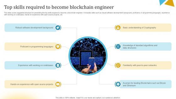 This slide covers suggested structure for presenting the top skills required to become a blockchain engineer. It includes skills such as robust software development background, proficiency in programming languages, experience with working on codebases, hands on experience with open source projects, etc. If you are looking for a format to display your unique thoughts, then the professionally designed Top Skills Required To Become Blockchain Engineer PPT Presentation BCT SS V is the one for you. You can use it as a Google Slides template or a PowerPoint template. Incorporate impressive visuals, symbols, images, and other charts. Modify or reorganize the text boxes as you desire. Experiment with shade schemes and font pairings. Alter, share or cooperate with other people on your work. Download Top Skills Required To Become Blockchain Engineer PPT Presentation BCT SS V and find out how to give a successful presentation. Present a perfect display to your team and make your presentation unforgettable. This slide covers suggested structure for presenting the top skills required to become a blockchain engineer. It includes skills such as robust software development background, proficiency in programming languages, experience with working on codebases, hands on experience with open source projects, etc.