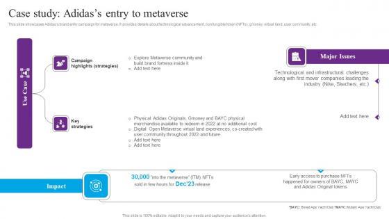 This slide showcases Adidass brand entry campaign for metaverse. It provides details about technological advancement, non fungible token NFTs, gmoney, virtual land, user community, etc. Crafting an eye catching presentation has never been more straightforward. Let your presentation shine with this tasteful yet straightforward Case Study Adidass Entry Centric Marketing To Enhance Brand Connections Icons Pdf template. It offers a minimalistic and classy look that is great for making a statement. The colors have been employed intelligently to add a bit of playfulness while still remaining professional. Construct the ideal Case Study Adidass Entry Centric Marketing To Enhance Brand Connections Icons Pdf that effortlessly grabs the attention of your audience Begin now and be certain to wow your customers This slide showcases Adidass brand entry campaign for metaverse. It provides details about technological advancement, non fungible token NFTs, gmoney, virtual land, user community, etc.