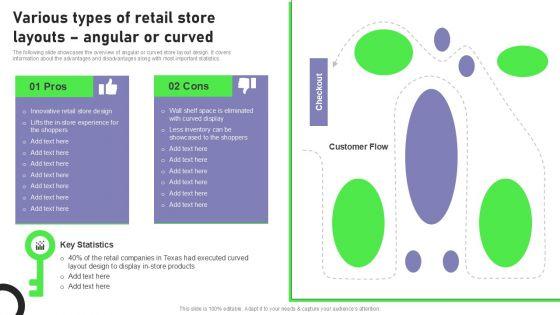 The following slide showcases the overview of angular or curved store layout design. It covers information about the advantages and disadvantages along with most important statistics. The Retail Outlet Opening To Enhance Product Sale Various Types Of Retail Store Layouts Angular Or Curved Topics PDF is a compilation of the most recent design trends as a series of slides. It is suitable for any subject or industry presentation, containing attractive visuals and photo spots for businesses to clearly express their messages. This template contains a variety of slides for the user to input data, such as structures to contrast two elements, bullet points, and slides for written information. Slidegeeks is prepared to create an impression.