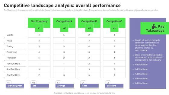 The following slide showcases competitive matrix which will assist the business houses to better understand the industry. The comparison is drawn on the basis of product quality, place, pricing, positioning and promotion. Do you know about Slidesgeeks Retail Outlet Opening To Enhance Product Sale Competitive Landscape Analysis Overall Topics PDF These are perfect for delivering any kind od presentation. Using it, create PowerPoint presentations that communicate your ideas and engage audiences. Save time and effort by using our pre designed presentation templates that are perfect for a wide range of topic. Our vast selection of designs covers a range of styles, from creative to business, and are all highly customizable and easy to edit. Download as a PowerPoint template or use them as Google Slides themes.