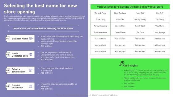 The following slide showcases major factors which will assist the retailers to select a simple and unique name for the new store such as business niche, name generator sites, selecting a simple name and domain availability. It also covers information about store name ideas such as general place, super shop etc. Find highly impressive Retail Outlet Opening To Enhance Product Sale Selecting The Best Name For New Store Opening Ideas PDF on Slidegeeks to deliver a meaningful presentation. You can save an ample amount of time using these presentation templates. No need to worry to prepare everything from scratch because Slidegeeks experts have already done a huge research and work for you. You need to download Retail Outlet Opening To Enhance Product Sale Selecting The Best Name For New Store Opening Ideas PDF for your upcoming presentation. All the presentation templates are 100 percent editable and you can change the color and personalize the content accordingly. Download now.