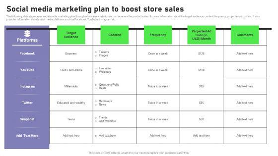 The following slide showcases social media marketing plan through which a new retail store can increase the product sales. It covers information about the target audience, content, frequency, projected ad cost etc. It also provides information about social media platforms such as Facebook, YouTube, Instagram etc. If your project calls for a presentation, then Slidegeeks is your go to partner because we have professionally designed, easy to edit templates that are perfect for any presentation. After downloading, you can easily edit Retail Outlet Opening To Enhance Product Sale Social Media Marketing Plan To Boost Microsoft PDF and make the changes accordingly. You can rearrange slides or fill them with different images. Check out all the handy templates.